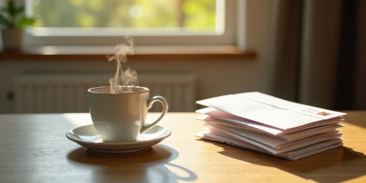 A steaming cup of coffee rests beside a stack of unopened correspondence on a sunlit wooden table.