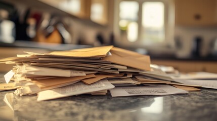 A Pile of Unopened Mail and Documents on a Kitchen Counter