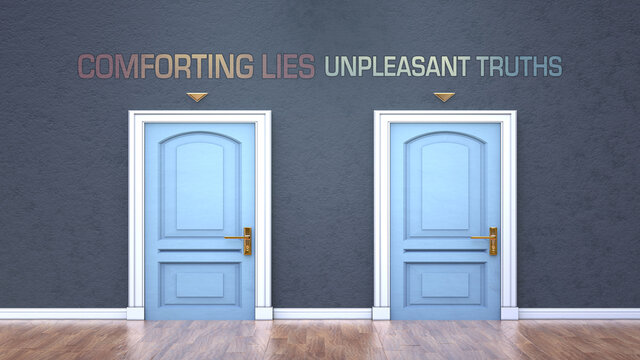 Comforting lies and unpleasant truths as a choice, pictured as words Comforting lies, unpleasant truths on doors to show that these are opposite options while making decision, 3d illustration