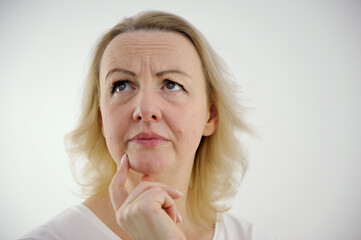 dissatisfied anxious Look at woman's hand near her chin think to worry woman raised her eyes up moved eyebrows one eyebrow higher than other wrinkled forehead white background unpleasant emotions