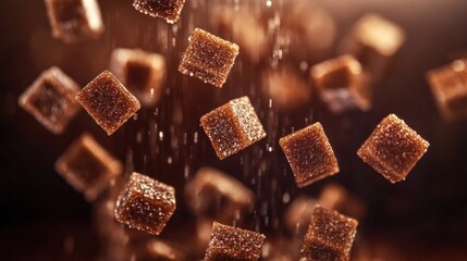 Elegant dark brown sugar cubes falling in a mesmerizing dance against a blurred dark background food photography
