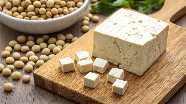Tofu block on a wooden board with soybeans in the background. Plant-based protein unprocessed concept.