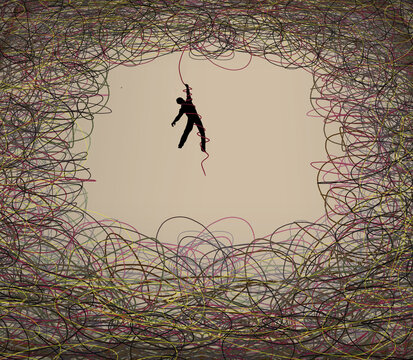 A man hangs on as he is tangled in a chaos of curling tangled colored lines in this illustration.