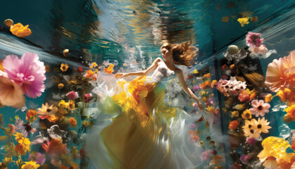 Pretty ginger woman floating in water in an unreal dreamlike fantasy