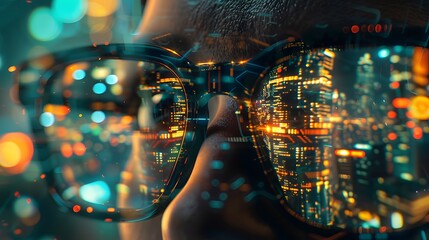 A pair of glasses reflecting a futuristic cityscape, surrounded by high-tech equipment and digital data streams, focused on a face, rendered in the style of unreal engine, with hyper-realistic detail.