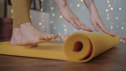 Young barefoot woman wearing sporty yellow leggings unrolls bright-colored yoga mat before practicing against illuminating garland closeup