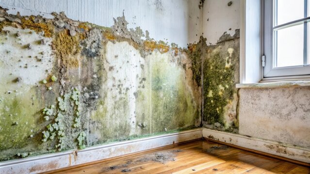 Closeup of a severely damaged wall with indoor mold, representing an unsanitary and hazardous environment