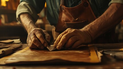 craftman working, mexican, close up, cinematographic style, leather, warm unsaturated tone, wide angle