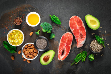 Food sources of healthy unsaturated fat: fresh raw salmon fillet, avocado, olives, nuts on cutting board on rustic stone background top view. Omega 3 and oil products, healthy nutrition and keto diet