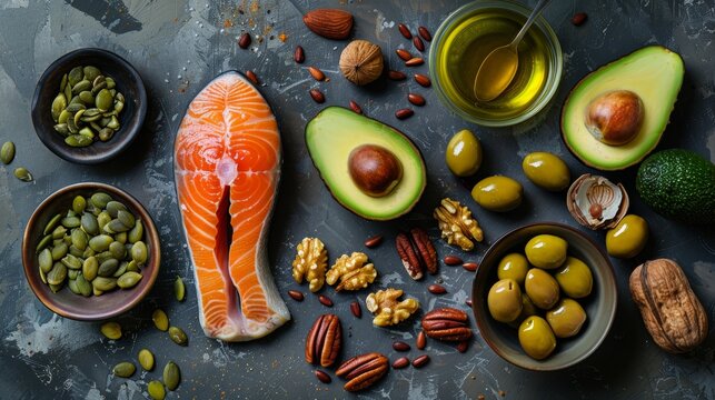 Healthy sources of unsaturated fat and omega 3 include fresh raw salmon avocado olives nuts Good for nutrition and keto diet Space for text