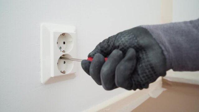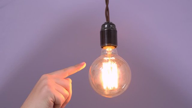 Human hand gently touches luminous bulb hanging on wire with finger, unscrews it from the base and twists it back. Fixing and testing of electricity and lighting equipment.