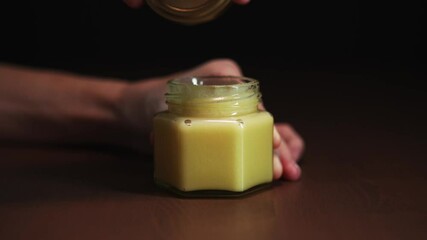 hands close-up unscrew the lid of a glass jar with cream honey on a wooden table and a dark background.