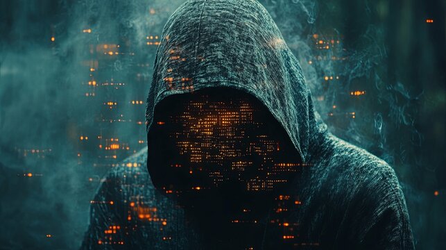 Phone scammers: a figure in a black hoodie holding a phone in the shadows. Covert cyber theft and fraud, with frightening and unseen attacks on privacy.