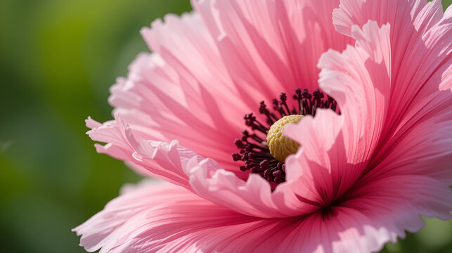 flower closeup, pink poppy blooming flower with ruffles, unsharp background, photorealistic