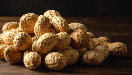 A close-up shot showcases a pile of unshelled peanuts, meticulously arranged on a textured, dark wooden surface. The lighting adds depth