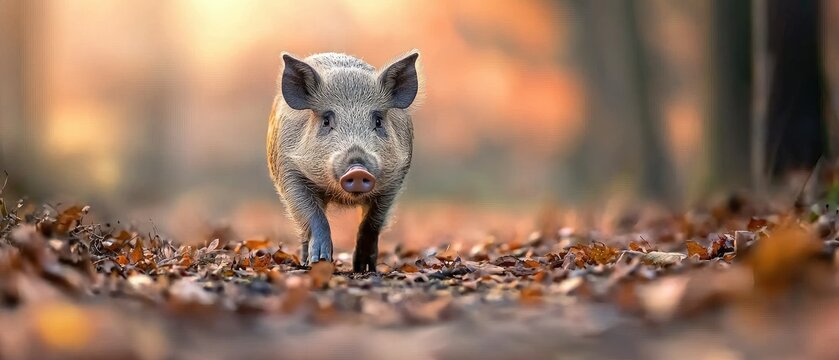 Captivating wild boar strolls through an autumn forest during golden hour with vibrant foliage