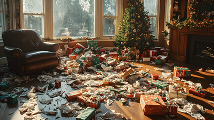 Post-Christmas floor scene with wrapping paper scraps, empty boxes, and packaging waste, messy holiday aftermath concept symbolizing gift exchange and seasonal clutter