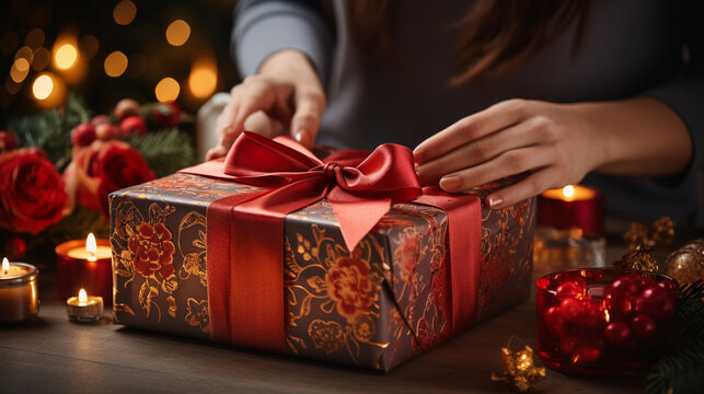 A close-up of hands unwrapping a beautifully wrapped gift box with a red bow, representing the tradition of gift-giving on Boxing Day