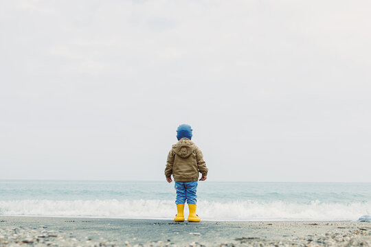 Child in yellow boots gazes at calm ocean waves on a cloudy day, experiencing the tranquility of nature by the shore