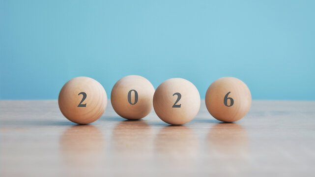 2026 - numbers on wooden balls. The arrival of the new year 2026, the concept of the holiday
