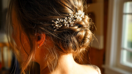 Elegant updo hairstyle with pearl hairpin in soft lighting