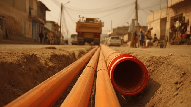 Large orange pipes are being installed in a trench on a city street, with construction vehicles and workers in the background