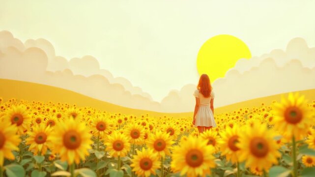 Woman standing gazing at sunrise in endless sunflower field, surrounded by green mountains white clouds and golden sun rays, uplifting scene, concept of summer nature wellness