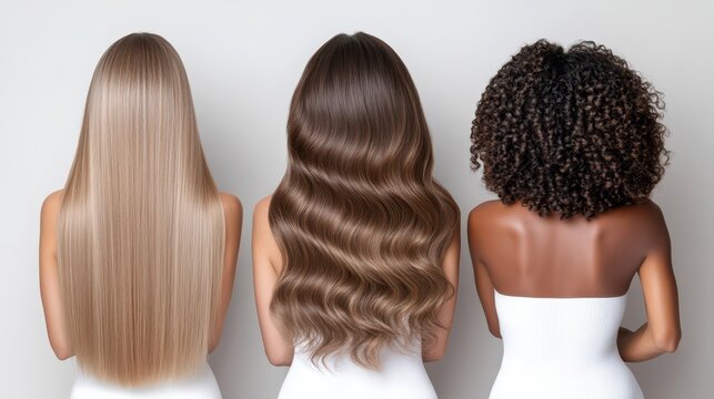 Three women showcase diverse hair types from the back against a simple white background