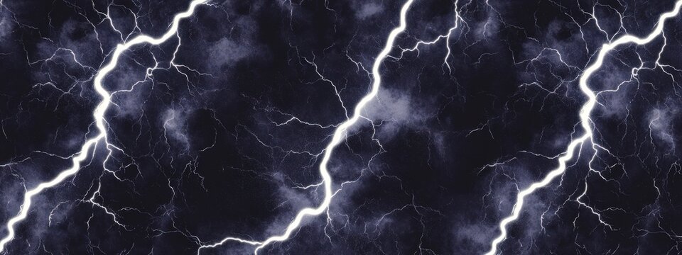 Powerful lightning bolts in dark stormy sky with dramatic cloudy background