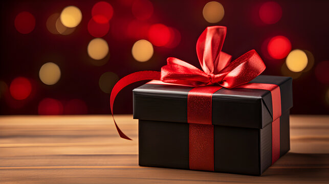 Photo of a black gift box with a red ribbon on a red background. Generative AI