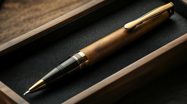 A stylish business card rests near a gleaming golden pen on a rich wood background, perfect for presentations