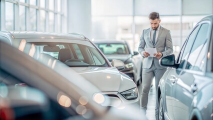Customer inspecting cars in a stylish, upscale showroom