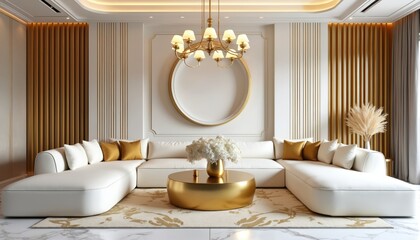 Luxurious modern living room interior featuring plush white sectional sofa, sleek gold coffee table with floral arrangement, elegant gold accents on walls, lighting. Textured rug, marble flooring