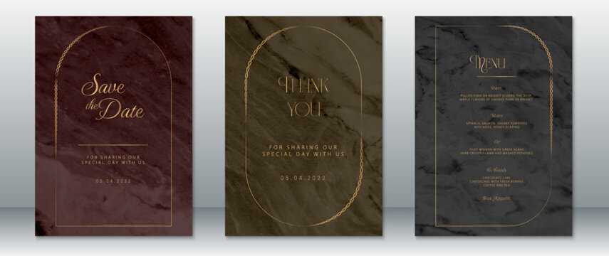 Luxurious wedding invitation set featuring gold rope frame on dark marble backgrounds in rich jewel tones. Includes save the date, thank you card, and dinner menu.