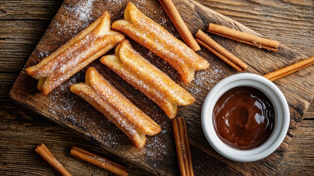 Premium churro bites with cinnamon sugar dusting served on rustic wooden board with rich chocolate dipping sauce at upscale Mexican restaurant