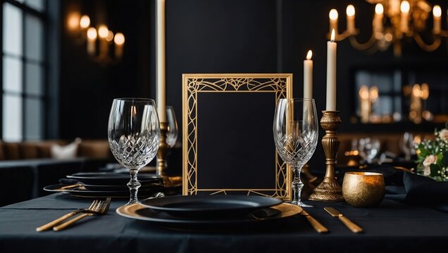 Fine dining table setting of luxury fancy restaurant empty menu invitation card mockup for weddings and romantic eating event decoration as wide banner with empty black copy space