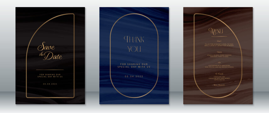 Stylish wedding invitation set featuring black, navy, and brown marble textures with refined gold borders. Includes save the date, thank you card, and dinner menu.