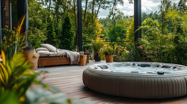 A telephoto angle photo of a jacuzzi in a luxury hotel suite, with plush towels and a glass of champagne on the side, with copy space
