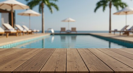 A luxurious tropical resort poolside scene with a wooden deck in the foreground