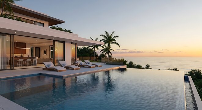 Luxurious villa with infinity pool overlooking the ocean at sunset creating a serene tropical