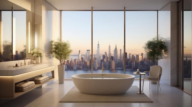 Modern penthouse apartment bathroom with expansive view of cityscape