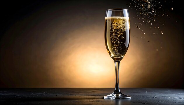 Elegant flute glass of sparkling wine with rising bubbles on a dark, illuminated background, perfect for celebrations and festive occasions