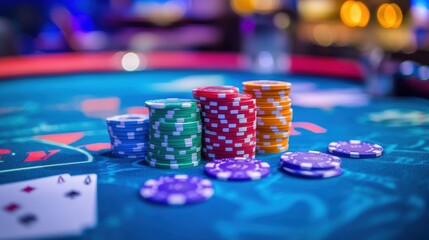Vibrant casino table featuring colorful stacks of poker chips during an exciting gambling night. Generative AI