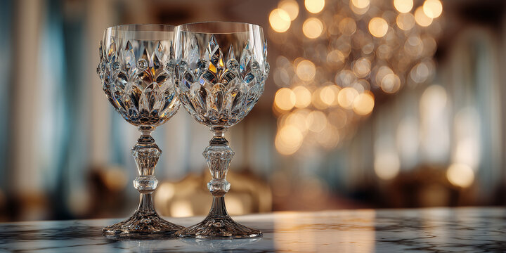 Minimalist crystal wine glass professional photography with soft overhead lighting creating beautiful reflection effects