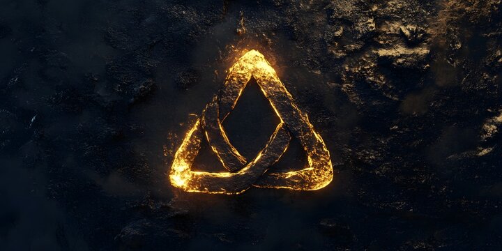 Glowing golden knotwork upsilon symbol rests on dark textured stone.