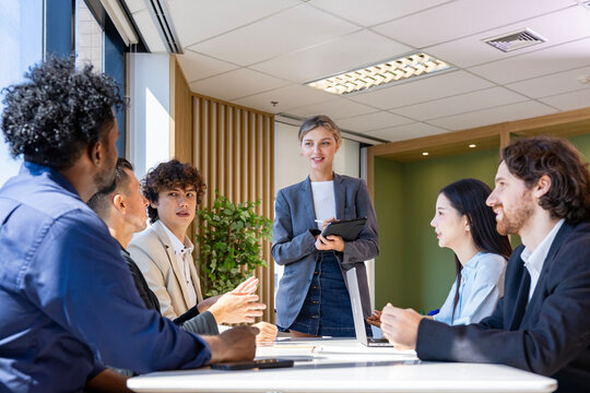 Caucasian woman sale manager is showing annual report to her colleagues in executive meeting for next year plan with market share increase for global business and investment