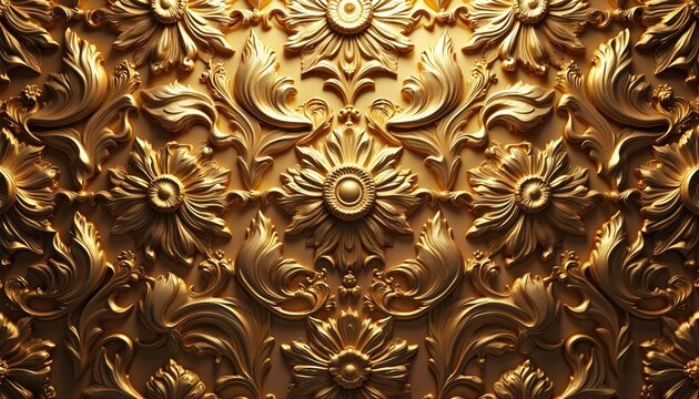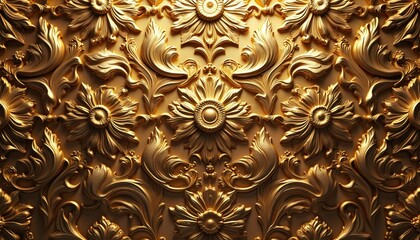 Golden illustration features intricate floral pattern with embossed, three-dimensional detail. Metallic surface with ornate, decorative relief work. Rich, luxury abstract design with geometric