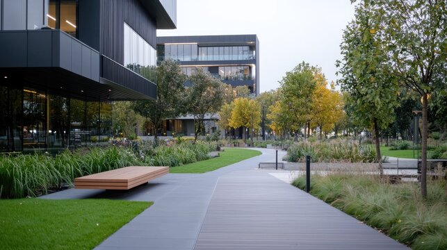 Modern office park pathway, autumn trees, landscaped grounds, employee relaxation