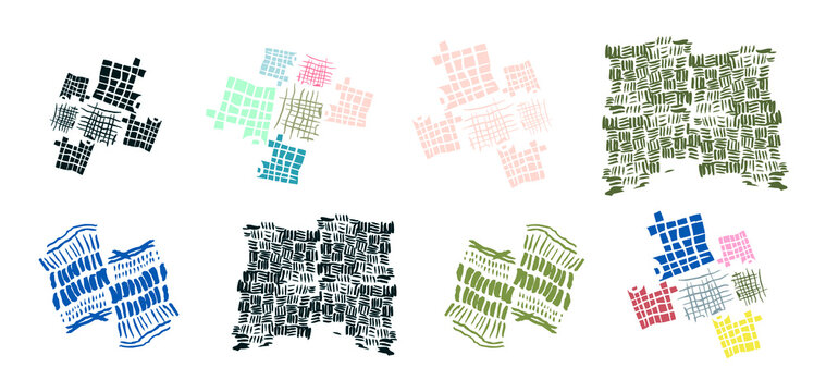 Abstract urban artwork. Geometric puzzle mosaic, urban area city project inspired pattern graphic design. Ink brush strokes pattern. Hand painted hand drawn organic dwelling. Printmaking art print