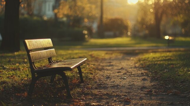 Scenic park at sunset, aerial view, winding paths, green landscape, urban skyline, serene atmosphere, recreational area, city park